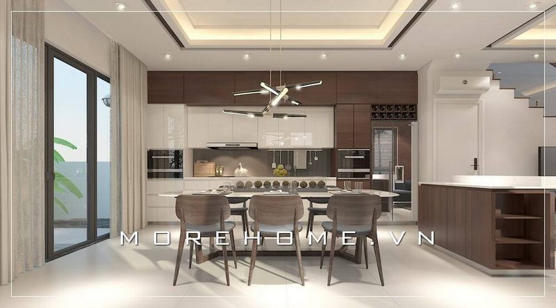 Tạo ra một không gian ăn uống thời thượng và đầy sang trọng bằng cách thiết kế nội thất phòng ăn liền bếp theo phong cách hiện đại, để cung cấp sự tiện nghi và tinh tế cho người sử dụng.